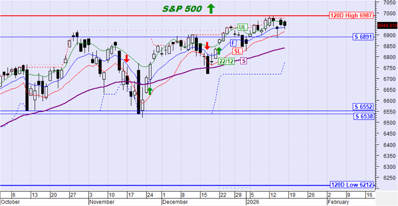 Η τιμή του S&P500 κινήθηκε διορθωτικά χωρίς σηματοδότηση. Η τιμή παραμένει ψηλότερα της SL και του αργού κινητού μέσου όρου S έτσι διατηρείται η ανοδική τάση.