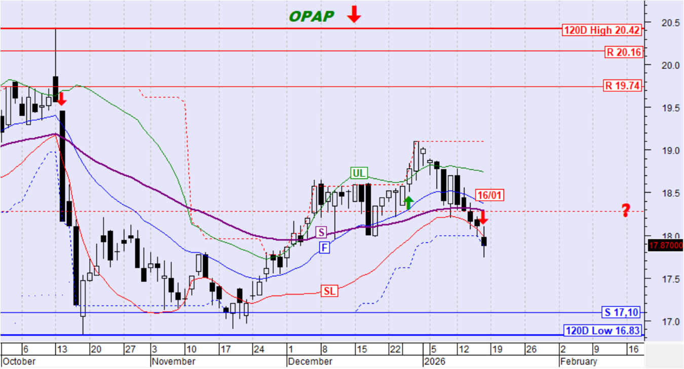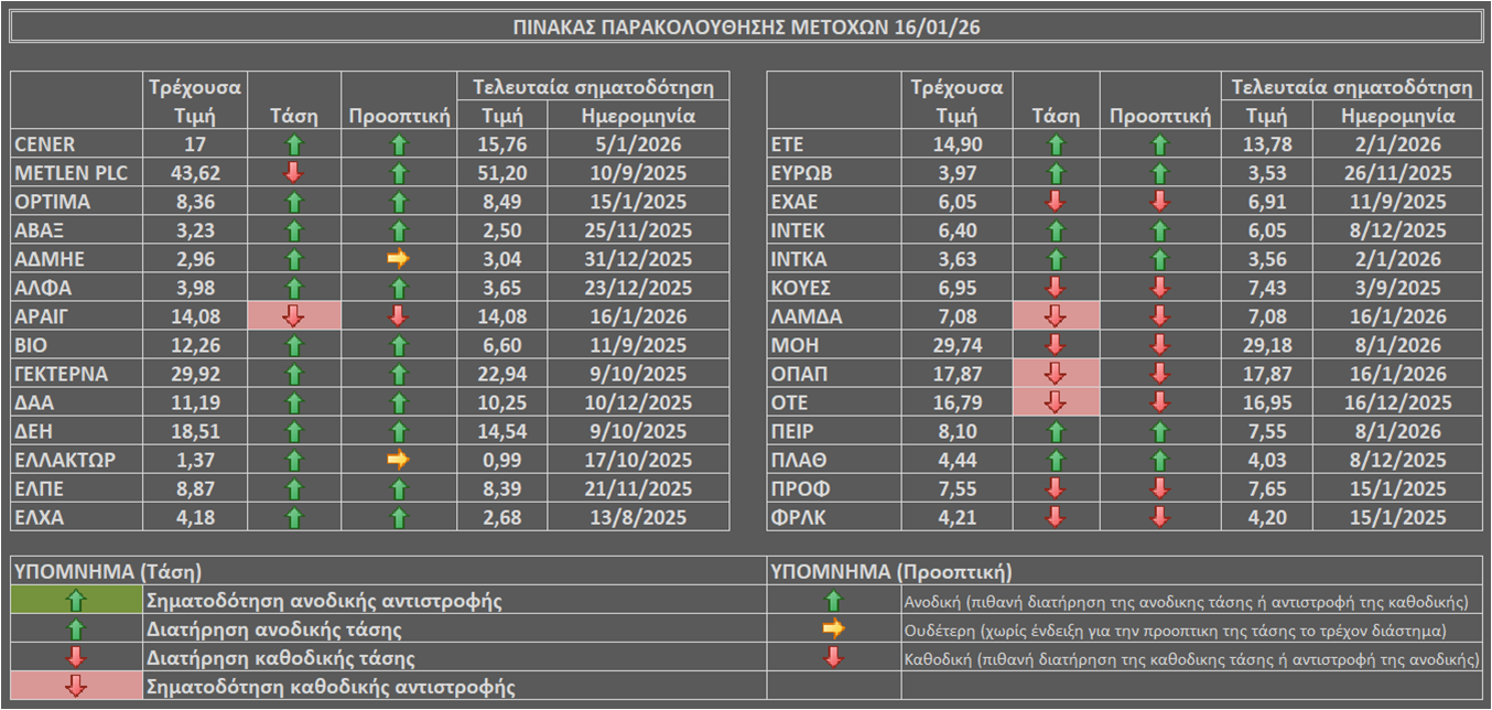 Η τάση και προοπτική των μετοχών του καλαθιού παρακολούθησης στο άνοιγμα της εβδομάδας (διαμόρφωση με το κλείσιμο της Παρασκευής 16/01) είναι όπως στον παρακάτω πίνακα.
