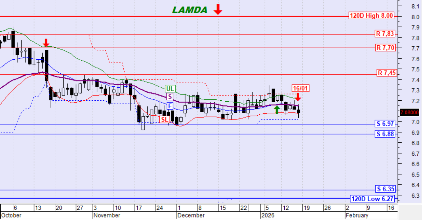 Η τιμή του FTSE25 κινήθηκε διορθωτικά χωρίς σηματοδότηση. Η τιμή παραμένει ψηλότερα της SL και του αργού κινητού μέσου όρου S έτσι διατηρείται η ανοδική τάση.