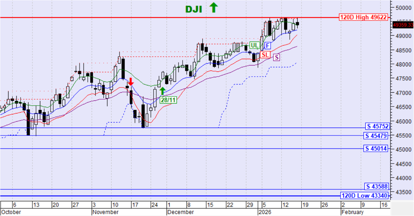 Η τιμή του DJI  κινήθηκε διορθωτικά χωρίς σηματοδότηση. Η τιμή παραμένει ψηλότερα της SL και του αργού κινητού μέσου όρου S έτσι διατηρείται η ανοδική τάση.