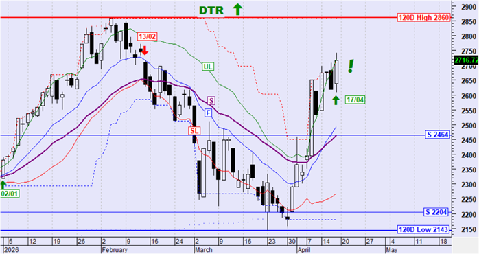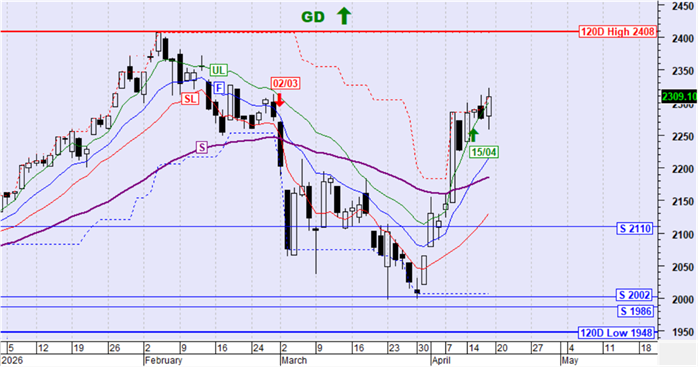 Ο ΓΔ κινήθηκε ανοδικά και διατηρεί την ανοδική τάση. Δεν υπάρχουν αντιστάσεις ψηλότερα της τιμής του δείκτη και έτσι υφίστανται πιθανότητες συνέχισης της ανόδου μέχρι το υψηλό των 120 ημερών.