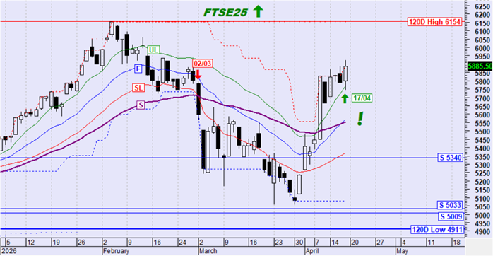 Ο FTSE25 κινήθηκε ανοδικά και διατήρησε την τιμή ψηλότερα της UL. Η τιμή κλεισίματος ημέρας C ήταν υψηλότερη από την τιμή ανοίγματος ημέρας Ο (άσπρο candlestick) και η τιμή του γρήγορου κινητού μέσου όρου F ήταν υψηλότερη του αργού S, με αποτέλεσμα τη σηματοδότηση αντιστροφής της τάσης σε ανοδική. Δεν υπάρχουν αντιστάσεις ψηλότερα της τιμής του δείκτη και έτσι υφίστανται πιθανότητες συνέχισης της ανόδου μέχρι το υψηλό των 120 ημερών.