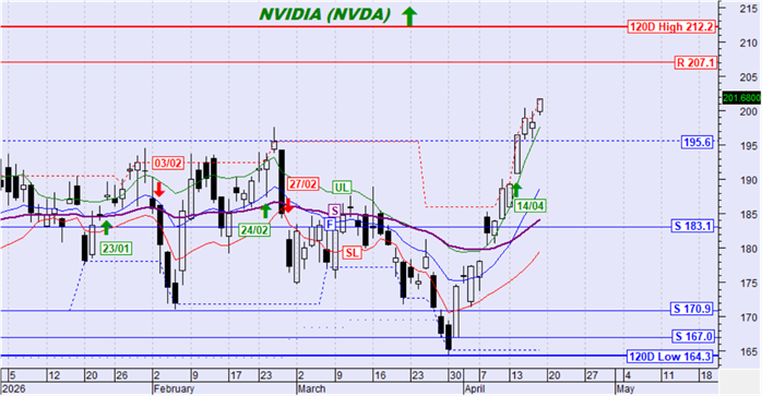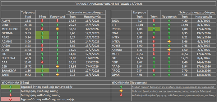 Η τάση και προοπτική των μετοχών του καλαθιού παρακολούθησης (διαμόρφωση με το κλείσιμο της Παρασκευής 17/04) είναι όπως στον παρακάτω πίνακα