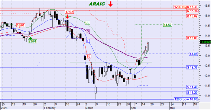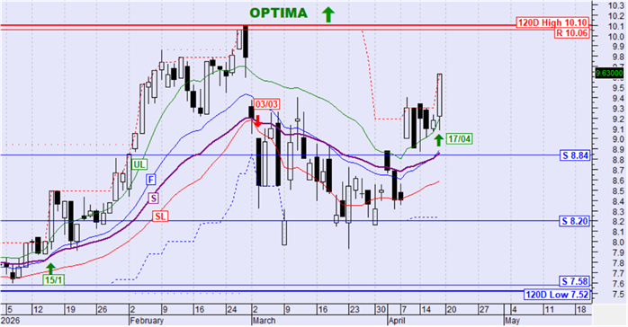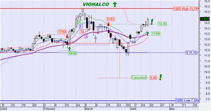 Η μετοχή κινήθηκε ανοδικά και διατήρησε την τιμή ψηλότερα της UL. Η τιμή κλεισίματος ημέρας C ήταν υψηλότερη από την τιμή ανοίγματος ημέρας Ο (άσπρο candlestick) και η τιμή του γρήγορου κινητού μέσου όρου F ήταν υψηλότερη του αργού S, με αποτέλεσμα τη σηματοδότηση αντιστροφής της τάσης σε ανοδική. Ακυρώθηκε ο σχηματισμός διπλής κορυφής όπως και ο καθοδικός στόχος στα 9,42€ μετά την υπέρβαση των 14,36€. Πιθανή μια κίνηση προς το υψηλό των 120 ημερών.