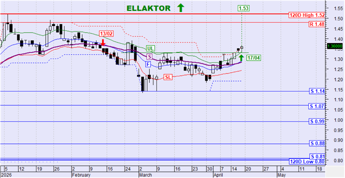 Η μετοχή κινήθηκε ανοδικά και διατήρησε την τιμή ψηλότερα της UL. Η τιμή κλεισίματος ημέρας C ήταν υψηλότερη από την τιμή ανοίγματος ημέρας Ο (άσπρο candlestick) και η τιμή του γρήγορου κινητού μέσου όρου F ήταν υψηλότερη του αργού S, με αποτέλεσμα τη σηματοδότηση αντιστροφής της τάσης σε ανοδική. Έχει ενεργοποιηθεί σχηματισμός διπλού πυθμένα που έχει ανοδικό στόχο στα 1,53€. Για να επιτευχθεί ο ανοδικός στόχος θα πρέπει η μετοχή να υπερβεί την αντίσταση στα 1,48€ και να πετύχει νέο υψηλό 120 ημερών.