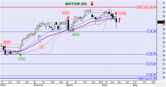 Η μετοχή κινήθηκε καθοδικά και πέτυχε την ταυτόχρονη καθοδική διάσπαση της SL και του αργού κινητού μέσου όρου S ενώ η τιμή κλεισίματος ημέρας C ήταν χαμηλότερη από την τιμή ανοίγματος ημέρας Ο (μαύρο candlestick) με αποτέλεσμα τη σηματοδότηση αντιστροφής της τάσης σε καθοδική. Η μετοχή είναι πολύ πιθανό να δοκιμάσει τη στήριξη στα 34,38€ που απέτρεψε την συνέχεια της καθόδου και στην προηγούμενη καθοδική σηματοδότηση στις αρχές Μαρτίου.