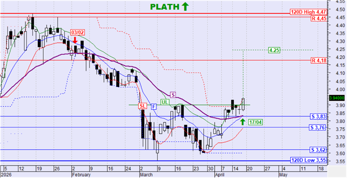 Η μετοχή κινήθηκε ανοδικά και πέτυχε την υπέρβαση της UL. Η τιμή κλεισίματος ημέρας C ήταν υψηλότερη από την τιμή ανοίγματος ημέρας Ο (άσπρο candlestick) και η τιμή του γρήγορου κινητού μέσου όρου F ήταν υψηλότερη του αργού S, με αποτέλεσμα τη σηματοδότηση αντιστροφής της τάσης σε ανοδική. Έχει ενεργοποιηθεί σχηματισμός διπλού πυθμένα που έχει ανοδικό στόχο στα 4,25€. Για να επιτευχθεί ο ανοδικός στόχος θα πρέπει η μετοχή να υπερβεί την αντίσταση στα 4,18€.