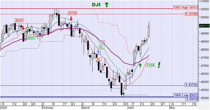 Ο DJI στην αρχή της εβδομάδας κινήθηκε ανοδικά και διατήρησε την τιμή ψηλότερα της UL. Η τιμή κλεισίματος ημέρας C ήταν υψηλότερη από την τιμή ανοίγματος ημέρας Ο (άσπρο candlestick) και η τιμή του γρήγορου κινητού μέσου όρου F ήταν υψηλότερη του αργού S, με αποτέλεσμα τη σηματοδότηση αντιστροφής της τάσης σε ανοδική. Στη διάρκεια της εβδομάδας συνέχισε έντονα ανοδικά και είναι πολύ πιθανή η δοκιμή της αντίστασης στις 50188 μονάδες και ίσως του υψηλού των 120 ημερών.