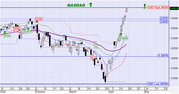 Ο NASDAQ στην αρχή της εβδομάδας κινήθηκε ανοδικά και διατήρησε την τιμή ψηλότερα της UL. Η τιμή κλεισίματος ημέρας C ήταν υψηλότερη από την τιμή ανοίγματος ημέρας Ο (άσπρο candlestick) και η τιμή του γρήγορου κινητού μέσου όρου F ήταν υψηλότερη του αργού S, με αποτέλεσμα τη σηματοδότηση αντιστροφής της τάσης σε ανοδική. Στη διάρκεια της εβδομάδας συνέχισε έντονα ανοδικά και πέτυχε νέο υψηλό 120 ημερών.