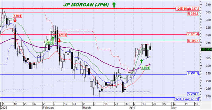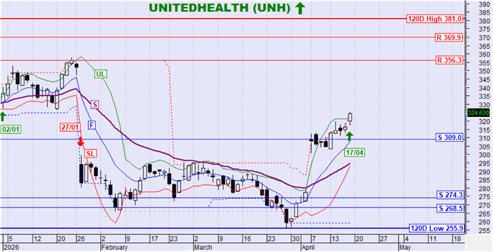 Η μετοχή στην αρχή της εβδομάδας κινήθηκε ανοδικά και διατήρησε την τιμή ψηλότερα της UL. Η τιμή κλεισίματος ημέρας C ήταν υψηλότερη από την τιμή ανοίγματος ημέρας Ο (άσπρο candlestick) και η τιμή του γρήγορου κινητού μέσου όρου F ήταν υψηλότερη του αργού S, με αποτέλεσμα τη σηματοδότηση αντιστροφής της τάσης σε ανοδική. Στη διάρκεια της εβδομάδας ανέκοψε την ανοδική κίνηση υπό την πίεση των αντιστάσεων στα 316,1$ και 320,4$.