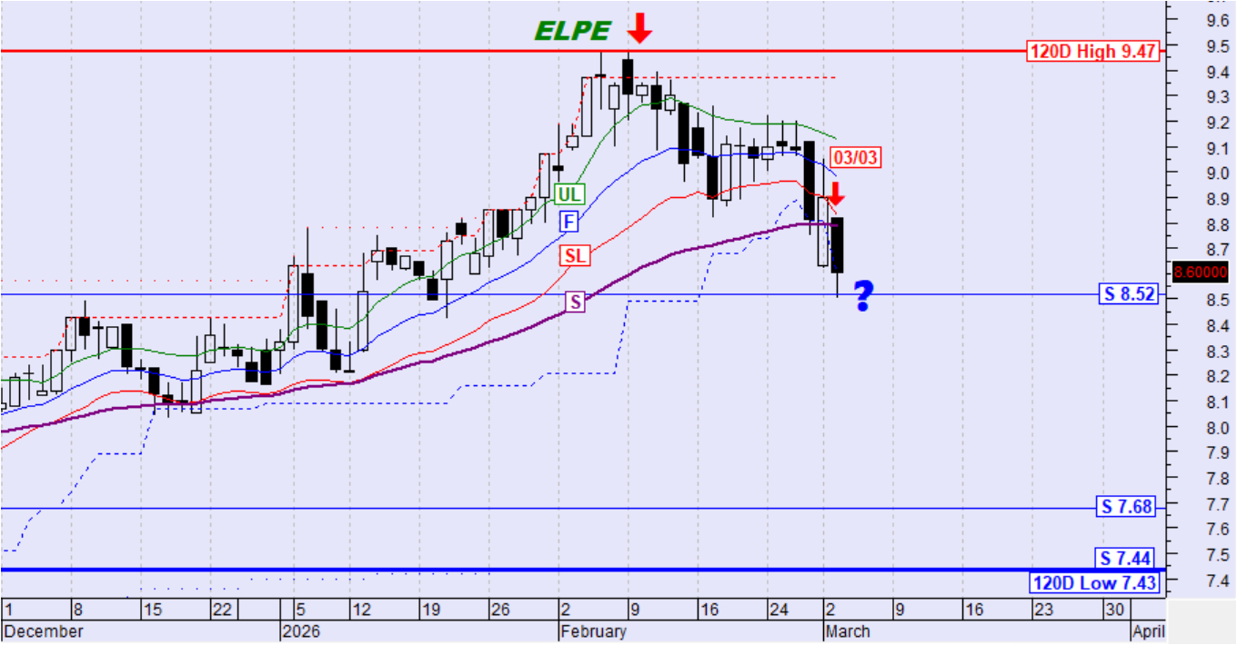 Η μετοχή κινήθηκε καθοδικά και πέτυχε την ταυτόχρονη καθοδική διάσπαση της SL και του αργού κινητού μέσου όρου S ενώ η τιμή κλεισίματος ημέρας C ήταν χαμηλότερη από την τιμή ανοίγματος ημέρας Ο (μαύρο candlestick) με αποτέλεσμα τη σηματοδότηση αντιστροφής της τάσης σε καθοδική. Έφτασε και δοκίμασε με επιτυχία τη στήριξη στα 8,52€ αντιδρώντας από το χαμηλό της ημέρας. Δεν αποκλείεται να υπάρξει και δεύτερη δοκιμή της στήριξης, όμως η τυχόν διατήρησή της θα περιορίσει σημαντικά την καθοδική δυναμική.