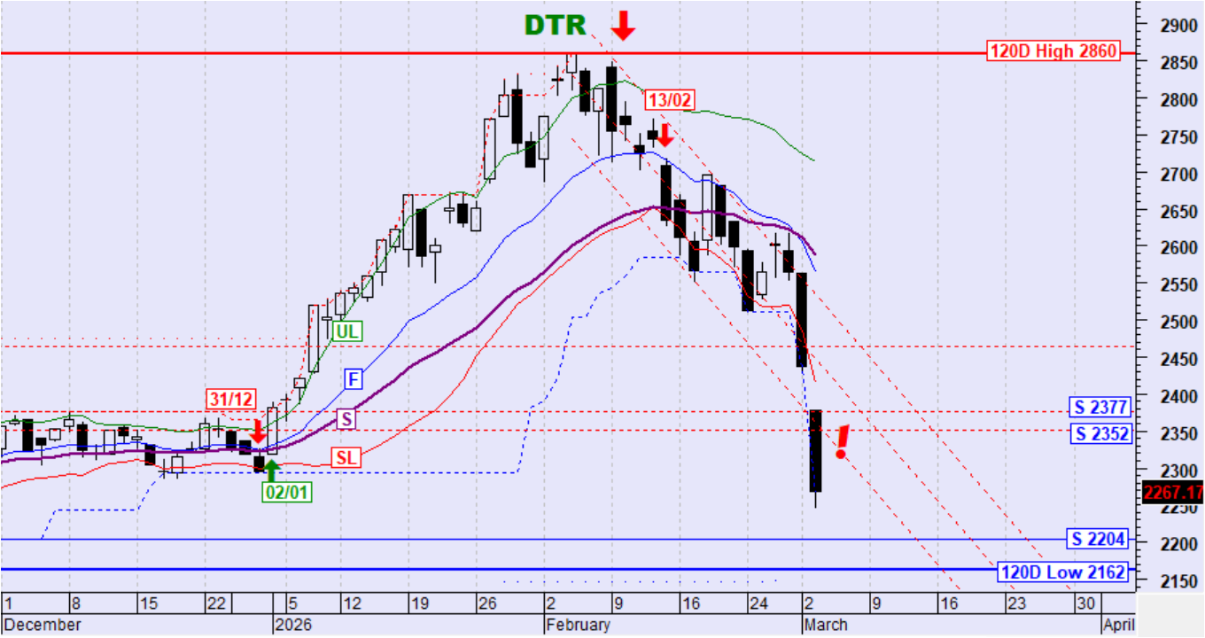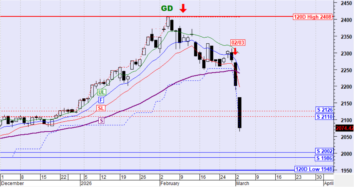 Ο ΓΔ κινήθηκε καθοδικά, και διέσπασε το ζεύγος στηρίξεων στις 2126-2110 μονάδες που δεν κατάφερε να επηρεάσει την τιμή του δείκτη και να ανακόψει την καθοδική κίνηση της τιμής του. Η προσδοκία αυτή μεταφέρεται στο επόμενο ακόμη πιο σημαντικό ζεύγος στηρίξεων στις 2002-1986 μονάδες