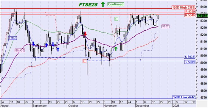 Ο FTSE25 την περασμένη εβδομάδα, κινήθηκε ήπια ανοδικά χωρίς σηματοδότηση. Ο ΕΜΑ5 διατηρεί την τιμή του ψηλότερα από τον ΕΜΑ30 και έτσι διατηρείται η μεσοπρόθεσμη ανοδική τάση.