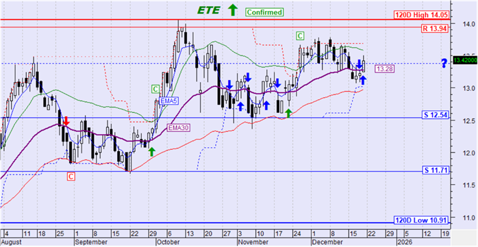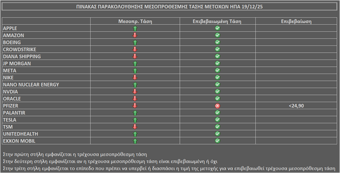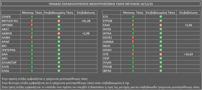 Η μεσοπρόθεσμη τάση των μετοχών του καλαθιού παρακολούθησης στο άνοιγμα της ερχόμενης εβδομάδας (διαμόρφωση με το κλείσιμο της Παρασκευής 19/12) είναι όπως στον παρακάτω πίνακα