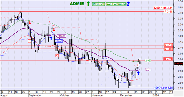 Το ημερήσιο όριο επιβεβαίωσης της αντιστροφής της τάσης σε ανοδική βρίσκεται στα 2,99€
