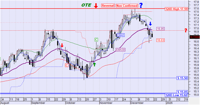 ο Εκθετικός Μέσος Όρος των 30 ημερών (ΕΜΑ30) στα 16,95€