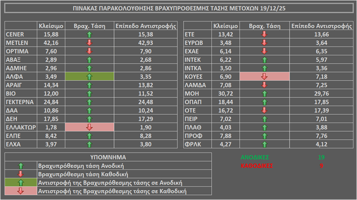Πέρα από την μεσοπρόθεσμη τεχνική εικόνα ενδιαφέρον έχει και η βραχυπρόθεσμη τάση των μετοχών του καλαθιού παρακολούθησης στο άνοιγμα της εβδομάδας (διαμόρφωση με το κλείσιμο της Παρασκευής 19/12) η οποία είναι όπως στον παρακάτω πίνακα