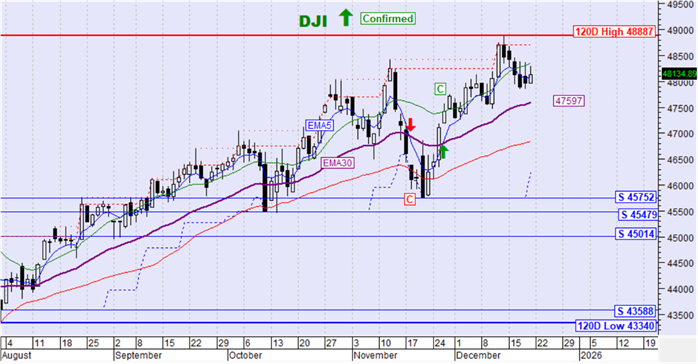 Ο αμερικανικός δείκτης DJI την περασμένη εβδομάδα κινήθηκε διορθωτικά χωρίς σηματοδότηση. Ο ΕΜΑ5 διατηρεί την τιμή του ψηλότερα από τον ΕΜΑ30 και έτσι διατηρείται η μεσοπρόθεσμη ανοδική τάση.