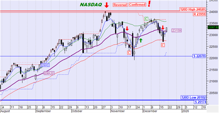 Ο δείκτης NASDAQ την περασμένη εβδομάδα κινήθηκε καθοδικά και πέτυχε την καθοδική διάσπαση του ΕΜΑ30. Ο ΕΜΑ5 διέσπασε καθοδικά τον ΕΜΑ30 ενώ ταυτόχρονα η τιμή διέσπασε και το όριο επιβεβαίωσης αντιστροφής της τάσης με αποτέλεσμα τη σηματοδότηση επιβεβαιωμένης αντιστροφής της μεσοπρόθεσμης τάσης σε καθοδική. Στη συνέχεια αντέδρασε ανοδικά χωρίς σηματοδότηση.