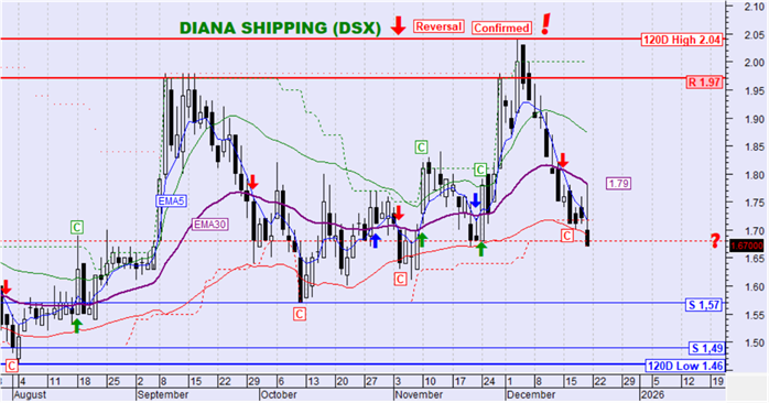 Η μετοχή την περασμένη εβδομάδα κινήθηκε καθοδικά και πέτυχε την καθοδική διάσπαση του ΕΜΑ30. Ο ΕΜΑ5 διέσπασε καθοδικά τον ΕΜΑ30 ενώ ταυτόχρονα η τιμή διέσπασε και το όριο επιβεβαίωσης αντιστροφής της τάσης με αποτέλεσμα τη σηματοδότηση επιβεβαιωμένης αντιστροφής της μεσοπρόθεσμης τάσης σε καθοδική.
