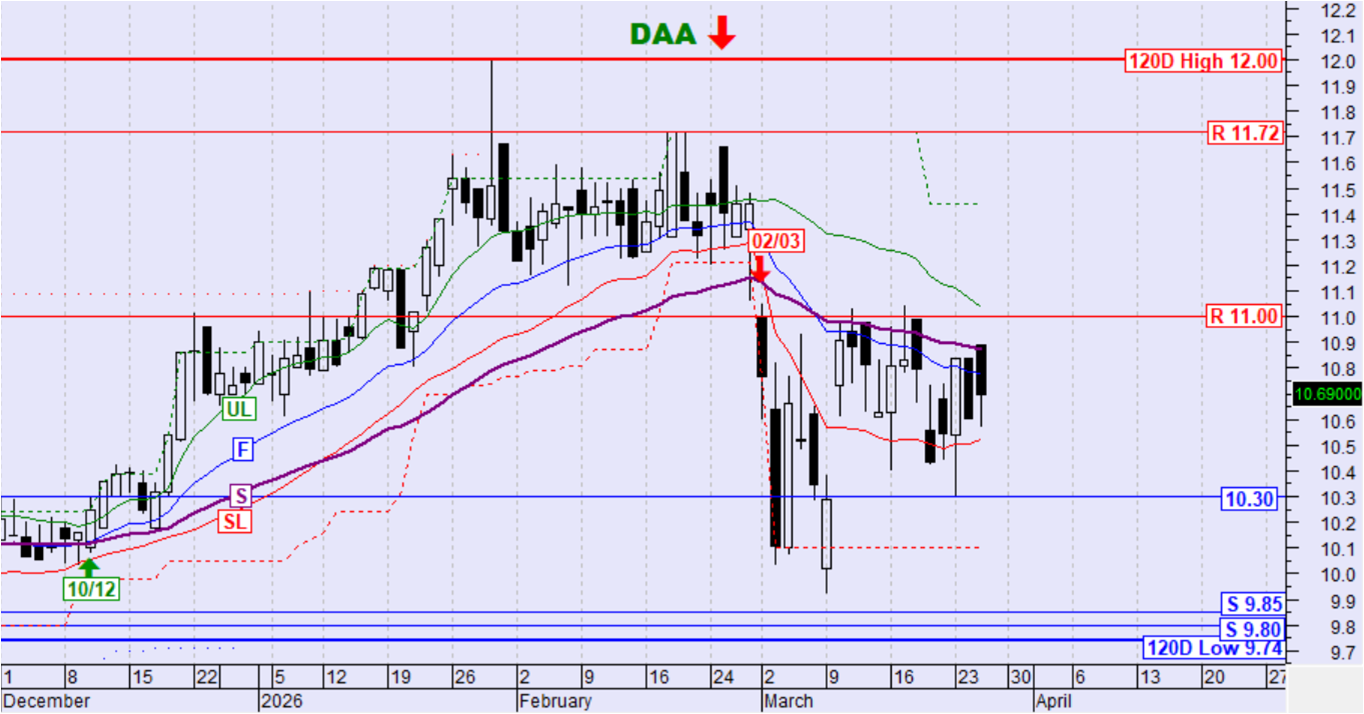 Η μετοχή κινήθηκε ανοδικά αλλά παραμένει χαμηλότερα των UL,F και S με αποτέλεσμα τη διατήρηση της καθοδικής τάσης. Για περισσότερο από δύο εβδομάδες η τιμή της μετοχής παραμένει μεταξύ της στήριξης στα 10,30€ και της αντίστασης στα 11,00€ που την εμποδίζουν να κινηθεί πέρα από αυτές. Η διάσπαση της στήριξης ή της αντίστασης είναι πιθανό να δημιουργήσει συνθήκες για συνέχιση της κίνησης προς την στήριξη στα 9,85€ ή την αντίσταση στα 11,72€ αντίστοιχα.