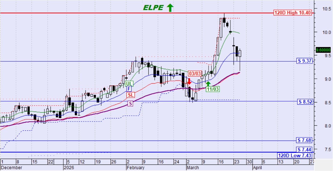 Η μετοχή κινήθηκε ανοδικά και διατηρεί την ανοδική τάση. Η τιμή βρήκε στήριξη στον αργό κινητό μέσο όρο S (στο χαμηλό της ημέρας) και διατήρησε στο κλείσιμο και την στήριξη στα 9,37€. Όσο διατηρεί αυτές τις στηρίξεις δεν διατρέχει κίνδυνο η ανοδική τάση.