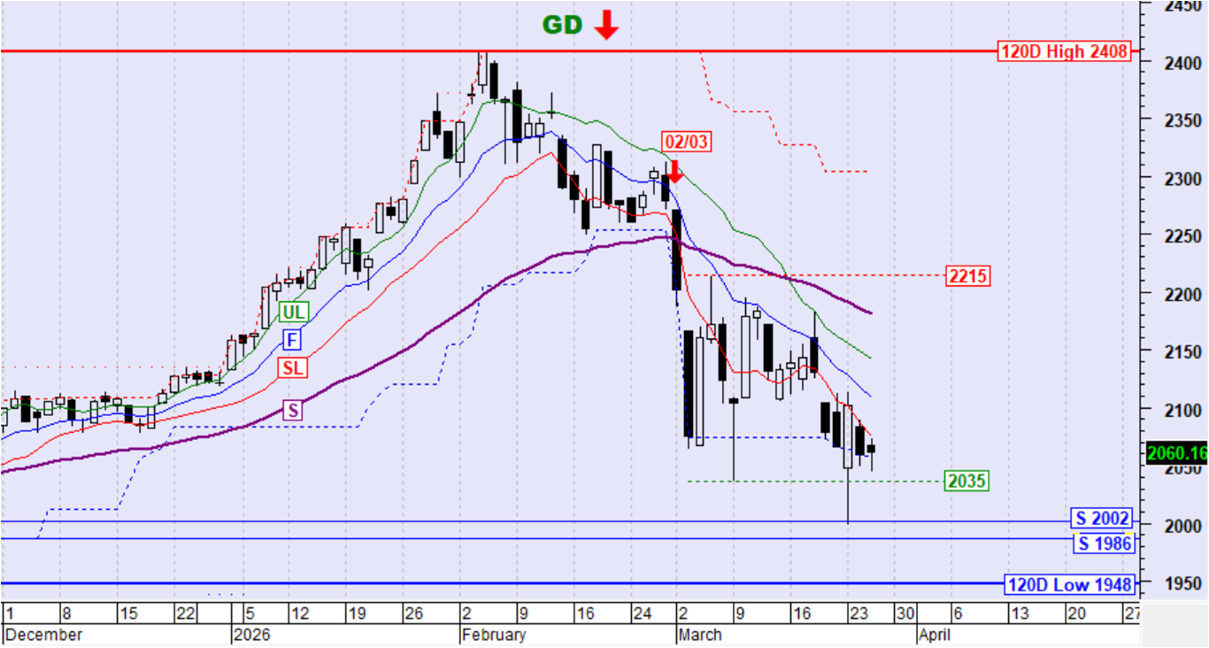 Ο ΓΔ κινήθηκε ήπια ανοδικά αλλά παραμένει αρκετά κοντά στο κάτω όριο της περιοχής συσσώρευσης στις 2035 μονάδες. Δεν υπάρχει κάποια σηματοδότηση και παραμένει πιθανή η εκ νέου προσέγγιση της στήριξης στις 2002 μονάδες.