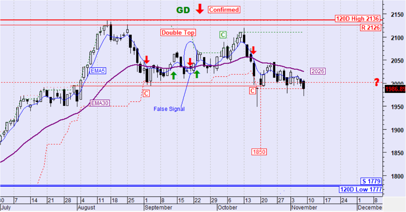 Ο ΓΔ την περασμένη εβδομάδα, κινήθηκε ήπια καθοδικά και διατήρησε την τιμή χαμηλότερα του ΕΜΑ30. Επίσης ο ΕΜΑ5 διατηρεί την τιμή του χαμηλότερα του ΕΜΑ30 με αποτέλεσμα τη διατήρηση της μεσοπρόθεσμης επιβεβαιωμένης καθοδικής τάσης. Παραμένει ενεργός ο σχηματισμός διπλής κορυφής ο οποίος έχει καθοδικό στόχο στις 1850 μονάδες.