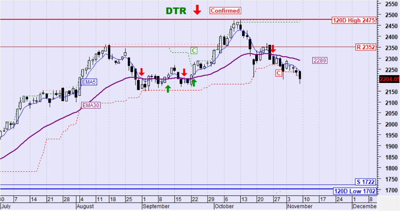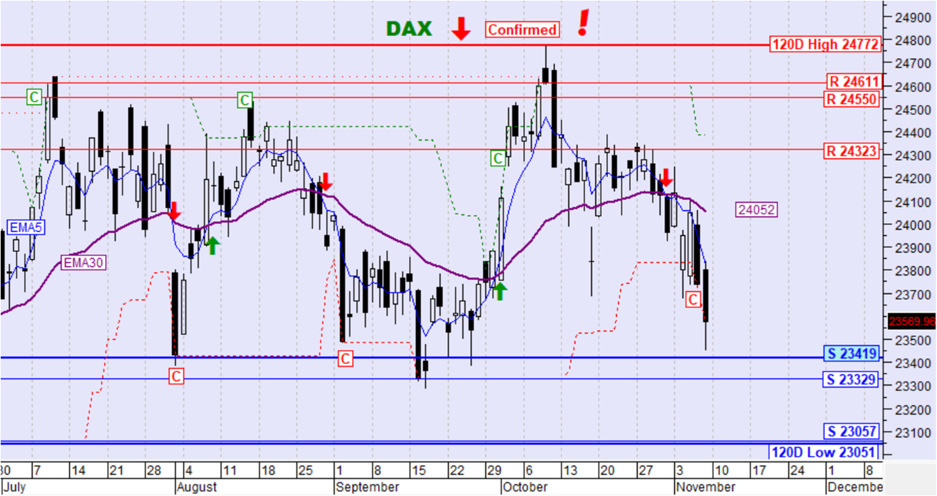 Ο Γερμανικός δείκτης την περασμένη εβδομάδα κινήθηκε καθοδικά και πέτυχε την καθοδική διάσπαση του ορίου επιβεβαίωσης της αντιστροφής της τάσης σε καθοδική με αποτέλεσμα την επιβεβαίωση της σηματοδότησης αντιστροφής της μεσοπρόθεσμης τάσης σε καθοδική.