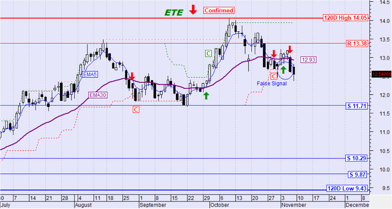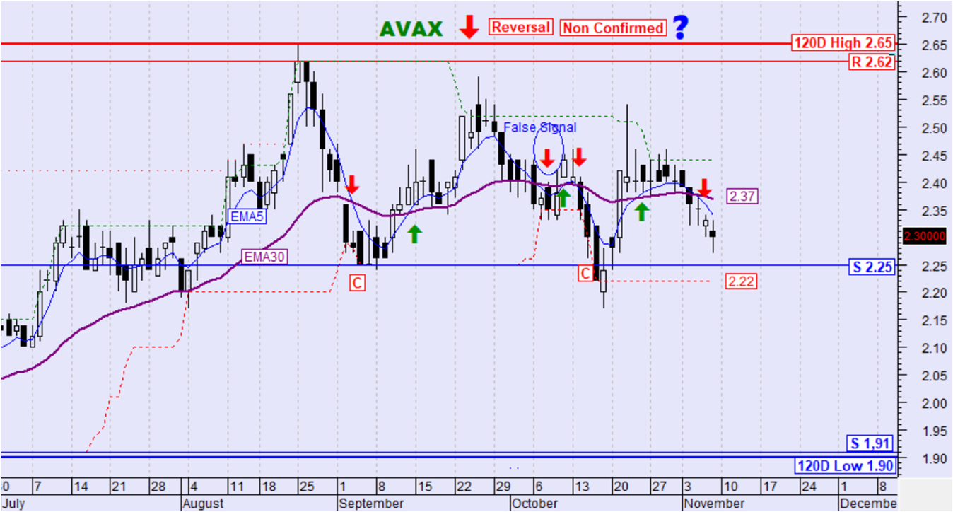 Η μετοχή την περασμένη εβδομάδα αρχικά κινήθηκε ανοδικά με τον ΕΜΑ5 να περνάει ψηλότερα από τον ΕΜΑ30 που είχε ως αποτέλεσμα τη σηματοδότηση αντιστροφής της μεσοπρόθεσμης τάσης σε ανοδική. Η σηματοδότηση αποδείχθηκε ψευδής αφού άμεσα η τιμή γύρισε καθοδικά και ο ΕΜΑ5 διέσπασε καθοδικά τον ΕΜΑ30 με αποτέλεσμα την ακύρωση της προηγούμενης ανοδικής σηματοδότησης