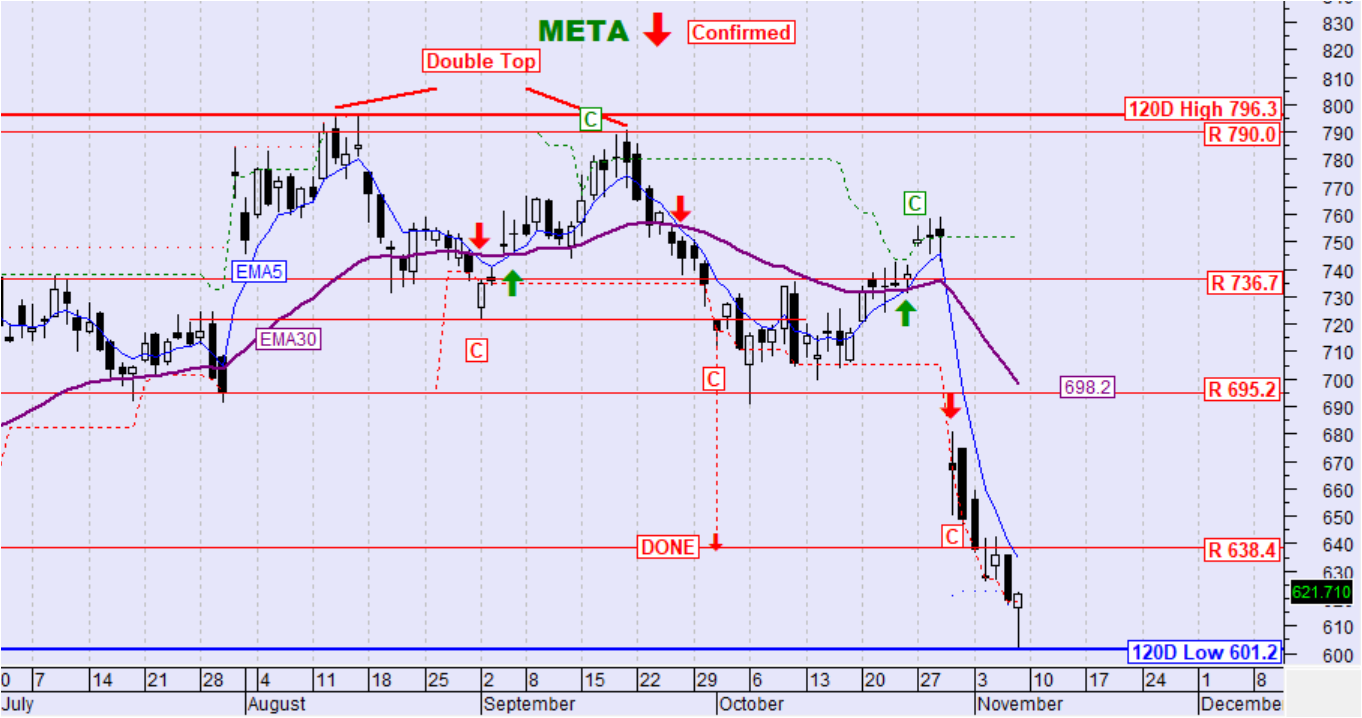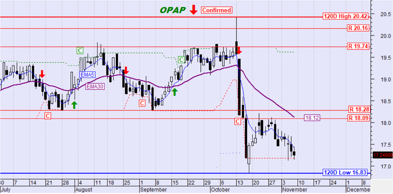 Η τιμή της μετοχής την περασμένη εβδομάδα κινήθηκε καθοδικά πέτυχε νέο χαμηλό 120 ημερών και διατήρησε την τιμή χαμηλότερα του ΕΜΑ30. Επίσης ο ΕΜΑ5 διατηρεί την τιμή του χαμηλότερα του ΕΜΑ30 με αποτέλεσμα τη διατήρηση της μεσοπρόθεσμης επιβεβαιωμένης καθοδικής τάσης. Επιτεύχθηκε ο καθοδικός στόχος του σχηματισμού διπλής κορυφής που είχε τεθεί πριν ένα μήνα περίπου.