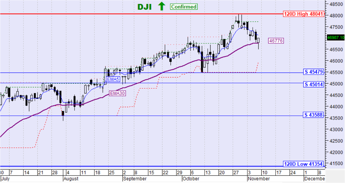 Ο αμερικανικός δείκτης DJI την περασμένη εβδομάδα κινήθηκε διορθωτικά χωρίς σηματοδότηση. Ο ΕΜΑ5 διατηρεί την τιμή του ψηλότερα από τον ΕΜΑ30 και έτσι διατηρείται η μεσοπρόθεσμη ανοδική τάση.