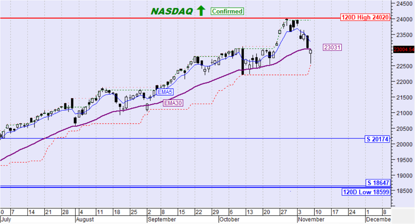 Ο δείκτης NASDAQ την περασμένη εβδομάδα κινήθηκε διορθωτικά και πέτυχε την καθοδική διάσπαση του ΕΜΑ30 χωρίς κάποια άλλη σηματοδότηση. Ο ΕΜΑ5 διατηρεί ακόμη την τιμή του ψηλότερα από τον ΕΜΑ30 και έτσι διατηρείται η μεσοπρόθεσμη ανοδική τάση.