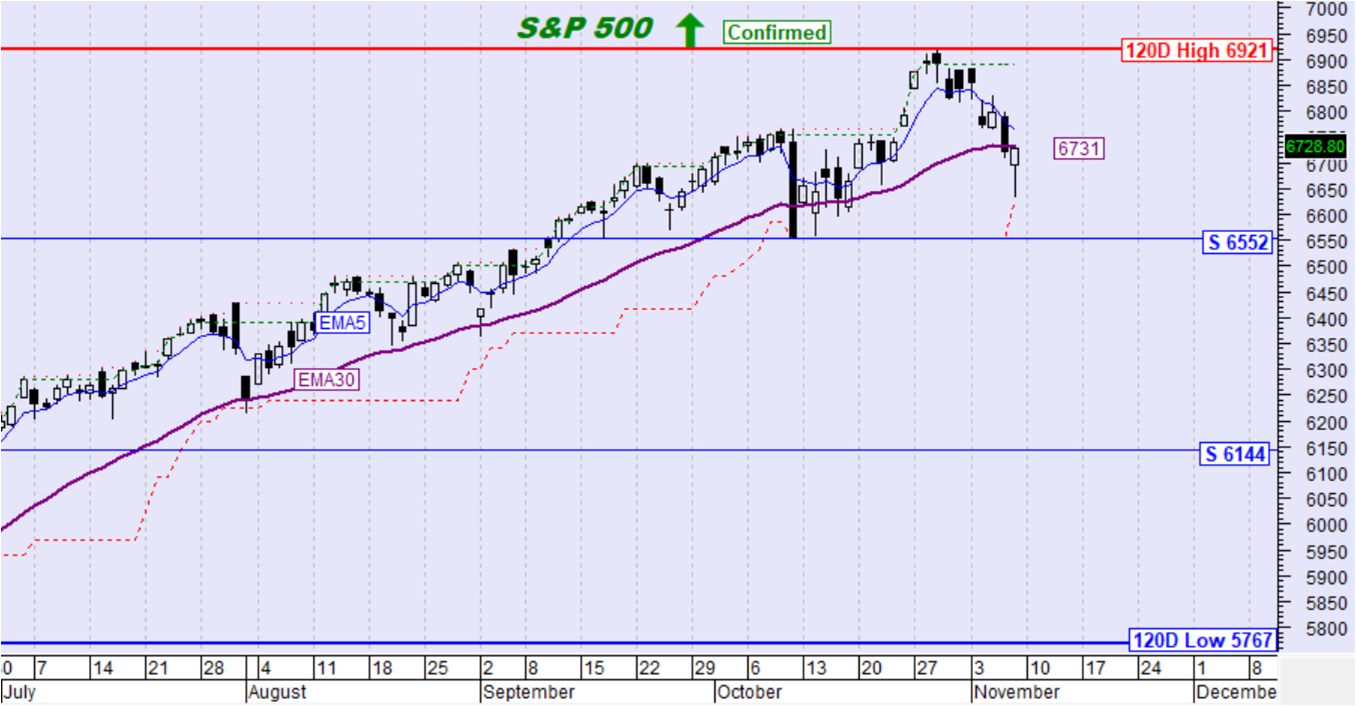 Ο δείκτης S&P500 την περασμένη εβδομάδα κινήθηκε διορθωτικά και πέτυχε την καθοδική διάσπαση του ΕΜΑ30 χωρίς κάποια άλλη σηματοδότηση. Ο ΕΜΑ5 διατηρεί ακόμη την τιμή του ψηλότερα από τον ΕΜΑ30 και έτσι διατηρείται η μεσοπρόθεσμη ανοδική τάση.
