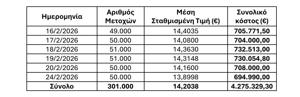 Στην απόκτηση επιπλέον 301.000 ίδιων μετοχών, με μέση τιμή €14,2038 και συνολικό κόστος €4,28 εκατ, προχώρησε η Εθνική Τράπεζα, στο πλαίσιο του εγκεκριμένου προγράμματος αγοράς, από 16/02/2026 έως 24/02/2026.