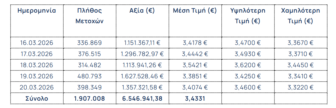 Η «Τράπεζα Eurobank Ανώνυμη Εταιρεία» (εφεξής η «Eurobank» ή η «Τράπεζα»), σε συνέχεια της από 12.12.2025 ανακοίνωσής της σχετικά με την έναρξη εφαρμογής του Προγράμματος Επαναγοράς Ιδίων Μετοχών («Πρόγραμμα»), το οποίο εγκρίθηκε με την απόφαση της Έκτακτης Γενικής Συνέλευσης των Μετόχων της Τράπεζας στις 22.10.2025, σύμφωνα με το άρθρο 49 του ν. 4548/2018, σε συνέχεια του αντίστοιχου προγράμματος της «Eurobank Ergasias Υπηρεσιών και Συμμετοχών Ανώνυμη Εταιρεία» («Eurobank Holdings») που θεσπίστηκε με την απόφαση της από 30.04.2025 Τακτικής Γενικής Συνέλευσης των Μετόχων της τελευταίας, και σε συνέχεια της από 22.10.2025 απόφασης του Διοικητικού Συμβουλίου της, ενημερώνει το κοινό ότι κατά το διάστημα 16.03.2026 – 20.03.2026 απέκτησε συνολικά, στο πλαίσιο του Προγράμματος, 1.907.008 μετοχές εκδόσεως της ιδίας («Ίδιες Μετοχές») που διαπραγματεύονται στο Χρηματιστήριο Αθηνών («Χ.Α.»), με μέση τιμή κτήσης €3,4331 ανά μετοχή και συνολικό κόστος €6.546.941,38.