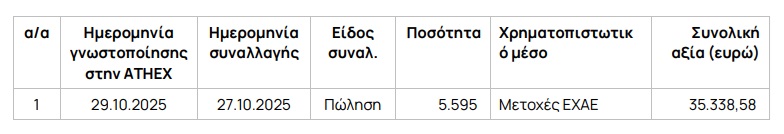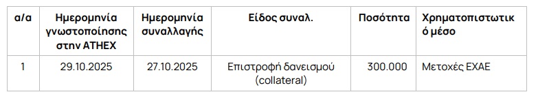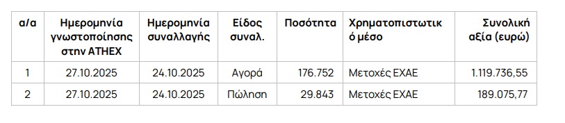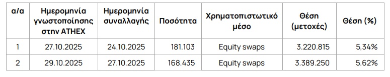 Επίσης, η SAND GROVE CAPITAL MANAGEMENT, Inc. με γραπτή γνωστοποίηση προς την Εταιρεία στις 27.10.2025 ενημερώνει ότι, ως αποτέλεσμα συναλλαγών την 23.10.2025, κατέχει
