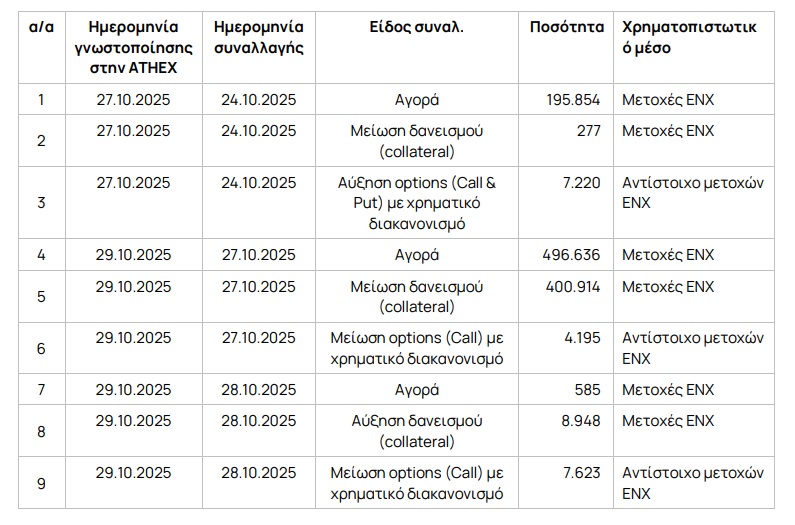 Επίσης, η SOCIETE GENERALE S.A.με γραπτή γνωστοποίηση προς την Εταιρεία ενημέρωσε ότι προέβη στις ακόλουθες συναλλαγές μετοχών της EuronextNV (σύμβολο ENX, ISINNL0006294274):