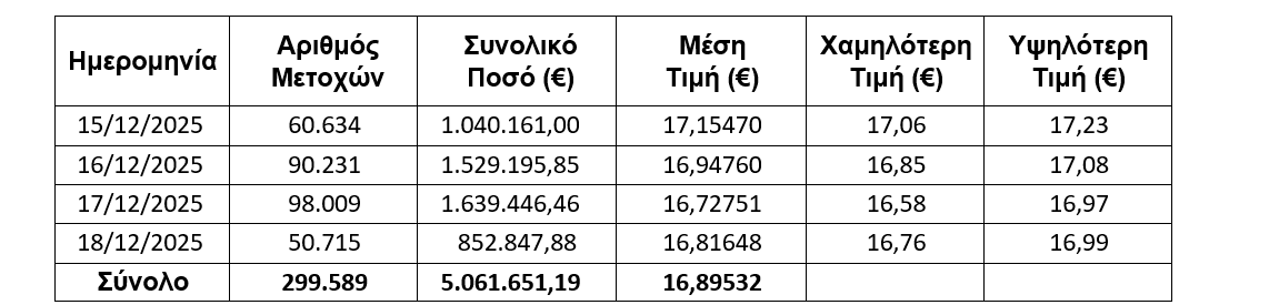 O Οργανισμός Τηλεπικοινωνιών της Ελλάδος Α.Ε. («ΟΤΕ Α.Ε.» ή «Εταιρεία»), ανακοινώνει ότι στο πλαίσιο του Προγράμματος Απόκτησης Ιδίων Μετοχών για το 2025, την περίοδο από 15/12/2025–18/12/2025, αγόρασε συνολικά 299.589 ίδιες μετοχές, ως ακολούθως: