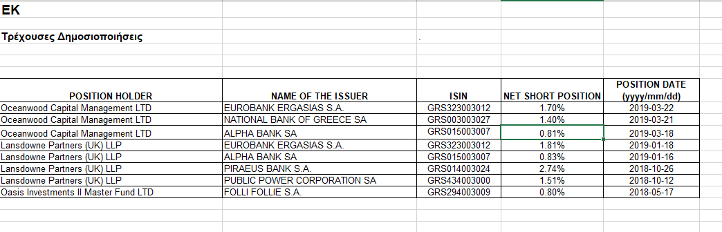 Πιο συγκεκριμένα, η Oceanwood αύξησε τη short θέση της στην Εθνική Τράπεζα στο 1,40% με νέα πώληση την Πέμπτη 21 Μαρτίου, από το προηγούμενο 1,31% της 12ης Μαρτίου.