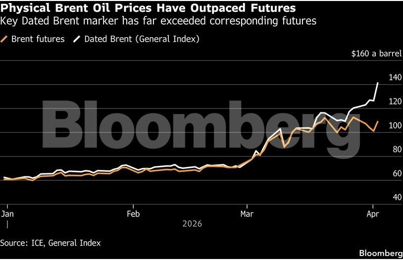 Πριν από το Σαββατοκύριακο του Πάσχα, το Dated Brent για άμεση αγορά – η σημαντικότερη τιμή στον κόσμο η οποία παρακολουθεί τις αποστολές της Βόρειας Θάλασσας – εκτινάχθηκε πάνω από τα 140 δολάρια, στο υψηλότερο επίπεδο από το 2008.