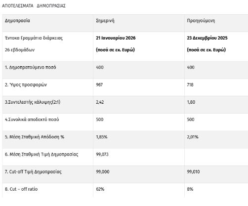 Σήμερα διενεργήθηκε δημοπρασία εντόκων γραμματίων διάρκειας 26 εβδομάδων (εξάμηνα έντοκα), ύψους 400 εκατομμυρίων ευρώ, με την απόδοση να διαμορφώθηκε στο 1,85%, από το 2,01% στην προηγούμενη δημοπρασία της 23ης Δεκεμβρίου.