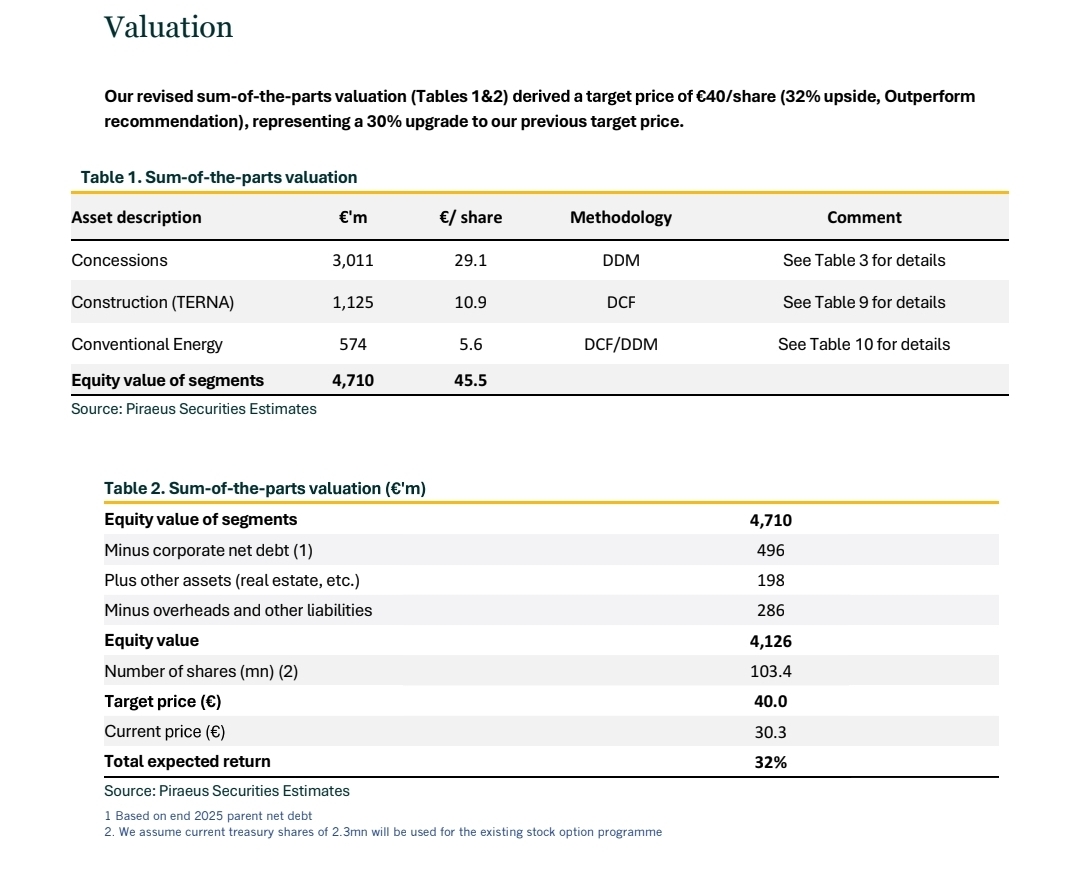 Καθοριστικό ρόλο στην αναθεώρηση παίζει η επανεκτίμηση του χαρτοφυλακίου παραχωρήσεων, με την Piraeus Securities να θεωρεί ότι ορισμένα assets και ειδικά η Εγνατία Οδός, αποτιμώνται πλέον σε υψηλότερα επίπεδα, αντανακλώντας τη βελτιωμένη ορατότητα λειτουργικών αποτελεσμάτων και μελλοντικών διανομών. Στο ίδιο πλαίσιο, ο οίκος εγκαταλείπει και την προηγούμενη συντηρητική προσέγγιση που περιλάμβανε έκπτωση συμμετοχής, εκτιμώντας ότι το ρίσκο εκτέλεσης έχει περιοριστεί αισθητά.