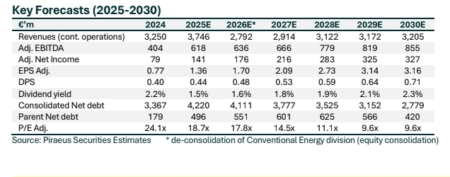 Με βάση τις επικαιροποιημένες προβλέψεις της, η Piraeus Securities εκτιμά ότι την περίοδο από τα μέσα της δεκαετίας και μετά ο όμιλος θα αρχίσει να εμφανίζει σημαντικές καθαρές ταμειακές εισροές, κυρίως από τις παραχωρήσεις, καθώς έργα που βρίσκονται σήμερα σε φάση ανάπτυξης ή ramp-up θα περνούν σταδιακά σε πλήρη λειτουργία. Οι διανομές αναμένεται να επιταχυνθούν προς το τέλος της δεκαετίας, ενισχύοντας το προφίλ του ομίλου ως παραγωγού μερισμάτων.