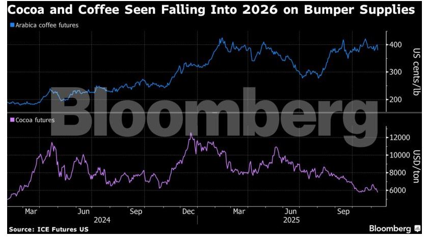 Όσον αφορά το κακάο, η Rabobank αναφέρει ότι οι τιμές θα παρατείνουν την πτώση τους και το επόμενο έτος, πιεσμένες από την παγκόσμια αύξηση της παραγωγής εν μέσω της συνεχιζόμενης αδυναμίας της ζήτησης.