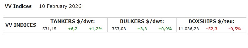 - Ο δείκτης των tankers ενισχύθηκε κατά 1,2% και διαμορφώθηκε στις 531,15 μονάδες.