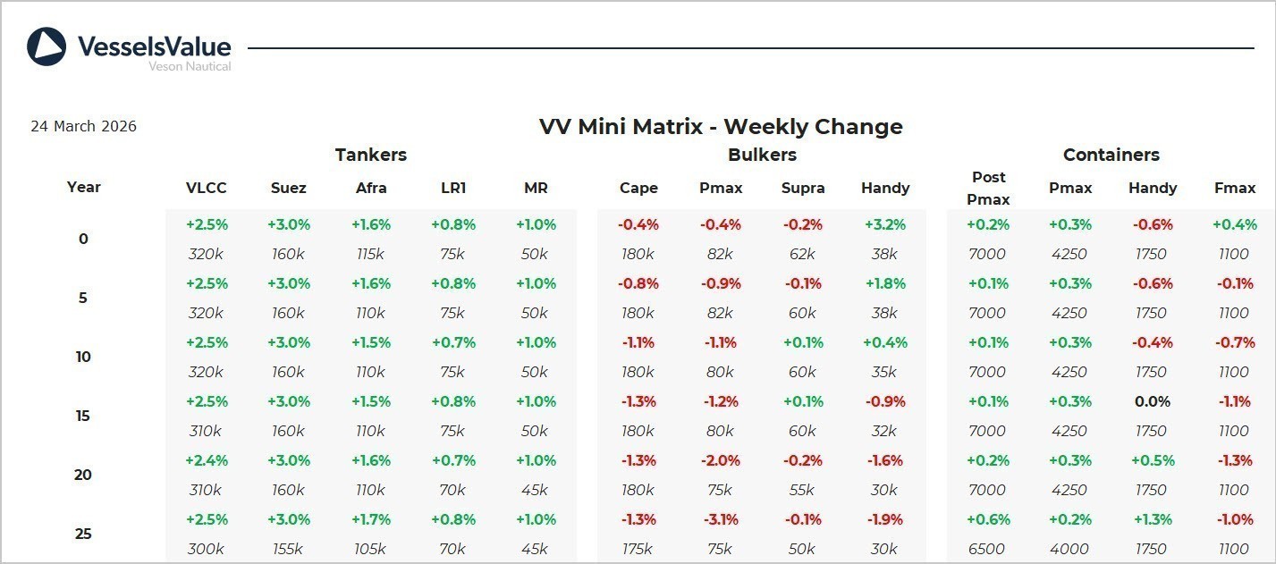 To mononews σε συνεργασία με την VesselsValue, τη διεθνώς αναγνωρισμένη πλατφόρμα δεδομένων που προσδιορίζει τις δίκαιες αποτιμήσεις των πλοίων, παρουσιάζει κάθε εβδομάδα πώς διαμορφώνονται οι αξίες τους στη ναυτιλιακή αγορά, σε συνδυασμό με τις πιο σημαντικές αγοραπωλησίες πλοίων.