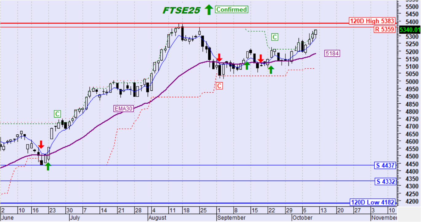 Ο FTSE25 την περασμένη εβδομάδα, κινήθηκε ανοδικά χωρίς σηματοδότηση. Ο ΕΜΑ5 διατηρεί την τιμή του ψηλότερα από τον ΕΜΑ30 και έτσι διατηρείται η μεσοπρόθεσμη ανοδική τάση.