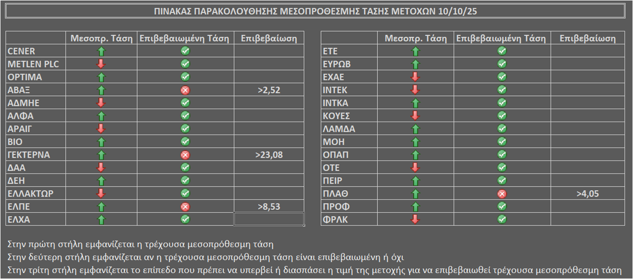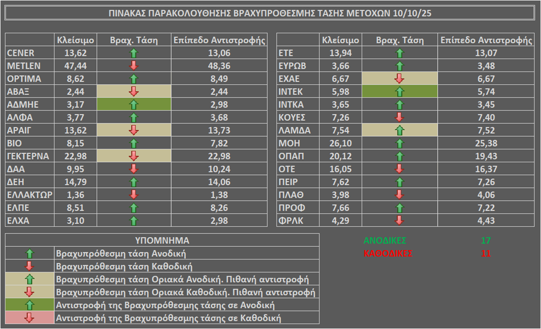 Πέρα από την μεσοπρόθεσμη τεχνική εικόνα ενδιαφέρον έχει και η βραχυπρόθεσμη τάση των μετοχών του καλαθιού παρακολούθησης στο άνοιγμα της εβδομάδας (διαμόρφωση με το κλείσιμο της Παρασκευής 10/10) η οποία είναι όπως στον παρακάτω πίνακα