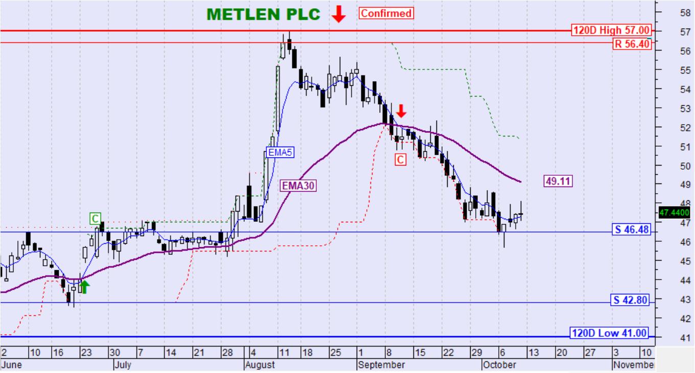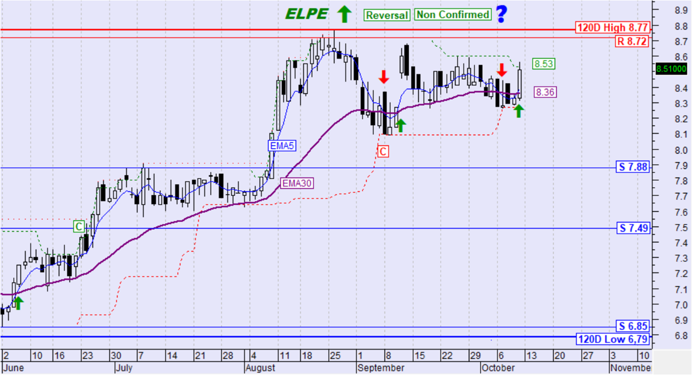 Η μετοχή την περασμένη εβδομάδα αρχικά κινήθηκε καθοδικά με τον ΕΜΑ5 να περνάει χαμηλότερα από τον ΕΜΑ30 που είχε ως αποτέλεσμα τη σηματοδότηση αντιστροφής της μεσοπρόθεσμης τάσης σε καθοδική. Στη συνέχεια κινήθηκε ανοδικά και πέτυχε την υπέρβαση του ΕΜΑ30. Ο ΕΜΑ5 πέρασε ψηλότερα του ΕΜΑ30 με αποτέλεσμα τη σηματοδότηση αντιστροφής της μεσοπρόθεσμης τάσης σε ανοδική. Η σηματοδότηση θα επιβεβαιωθεί με υπέρβαση του ορίου επιβεβαίωσης της αντιστροφής της τάσης σε ανοδική.